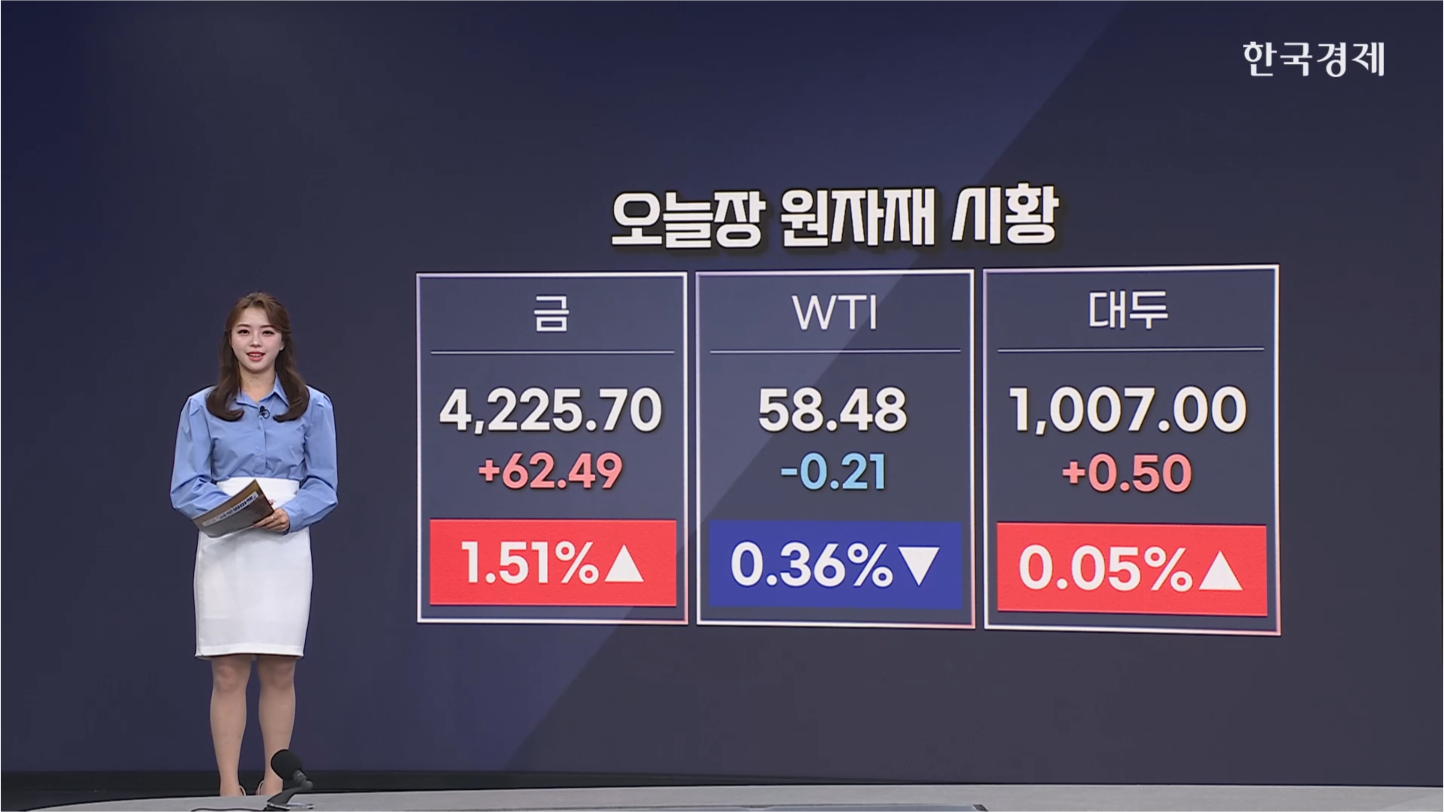 네, 원자재 시황도 살펴보겠습니다. 5시 수치를 기준으로 하고 있고요. 오늘장 눈에 띄었던 원자재 이슈들 보면, 금값은 이제 4,200달러 선도 뚫었습니다. 나날이 사상 최고치를 경신하는 모습이고요. 반대로 국제유가는 미중 무역갈등과 공급 과잉 전망 속 이틀 연속 하락세 보였습니다. 미중 무역협상의 핵심 사안 중 하나인 대두의 경우 오늘장에선 강보합에 거래됐습니다.