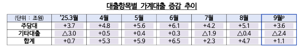 16일 금융위원회가 밝힌 ‘2025년 9월 중 가계대출 동향(잠정)’ 자료에 따르면 지난달 전 금융권 가계대출이 1조 1천억 원 증가했다. 가계대출은 지난 4월 증가 폭이 5조 원대로 급격히 늘어난 이후 7월에 2조 원대로 축소되었으나 8월에 다시 큰 폭으로 증가한 바 있다.