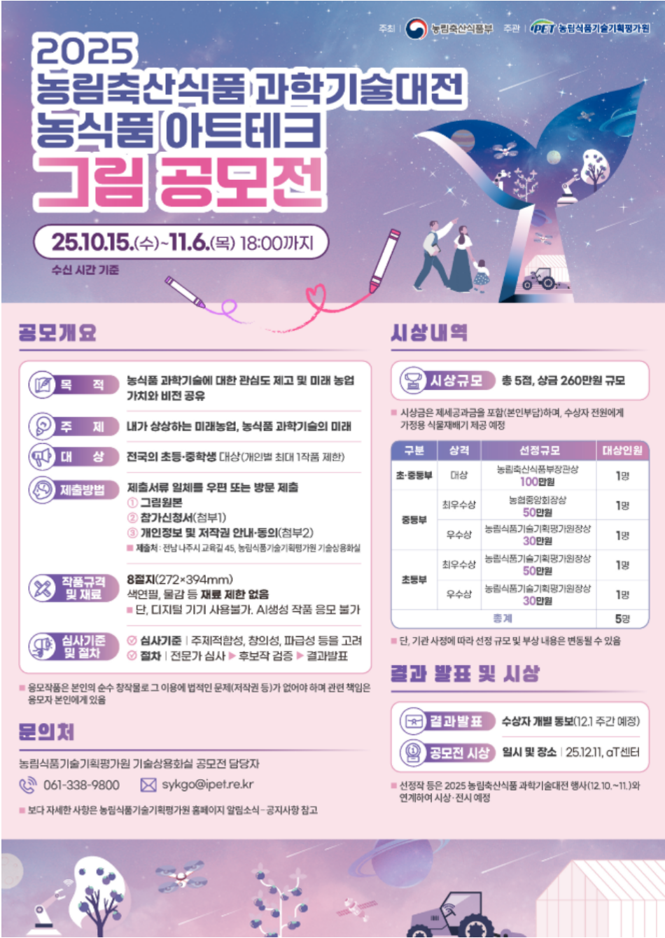 학생들의 농식품 과학기술에 대한 관심도를 높이고, 미래농업의 가치와 비전을 공유하기 위해 마련된 이번 공모전은 초등학생과 중학생을 대상으로 '내가 상상하는 미래 농업'을 주제로 진행한다.