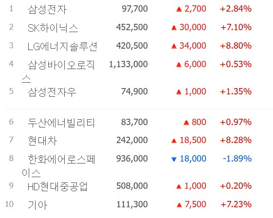 이날 시총 상위 10개 종목 가운데 한화에어로스페이스(-1.89%)를 제외하면 모두 빨간 불을 켰다.