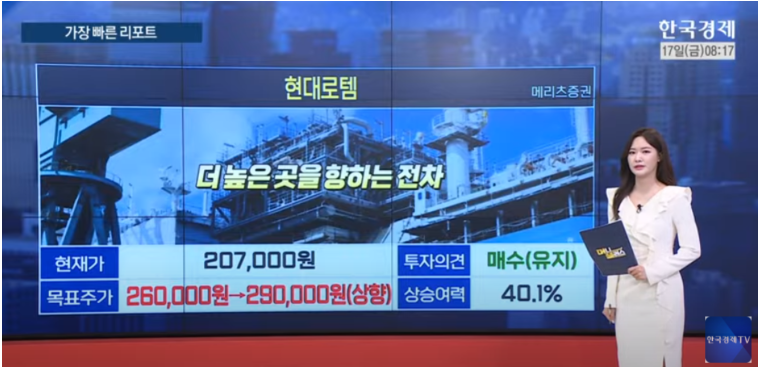 ● 핵심 포인트 [안혜수 한국경제TV 캐스터] - 현대로템의 목표가는 29만 원으로 상향되었으며, 이는 현재 주가 대비 약 40% 이상의 상승 여력을 의미함. - 3분기 실적 발표에서 매출은 35%, 영업이익은 거의 110% 증가할 것으로 예상되며, 폴란드 및 중동 국가들과의 추가 계약 가능성이 있음. - 엘앤에프의 목표가는 13만 원으로 상향되었고, 3분기에 2년 만에 흑자로 전환될 전망임. - 엘앤에프는 테슬라로의 양극재 출하가 늘면서 판매량이 크게 증가하고 있으며, ESS 시장의 확대로 인한 수혜도 기대됨. - 엘앤에프는 북미 고객사와 MOU를 맺으며 비중국계 유일한 LFP 공급업체로서의 입지를 다지고 있음.