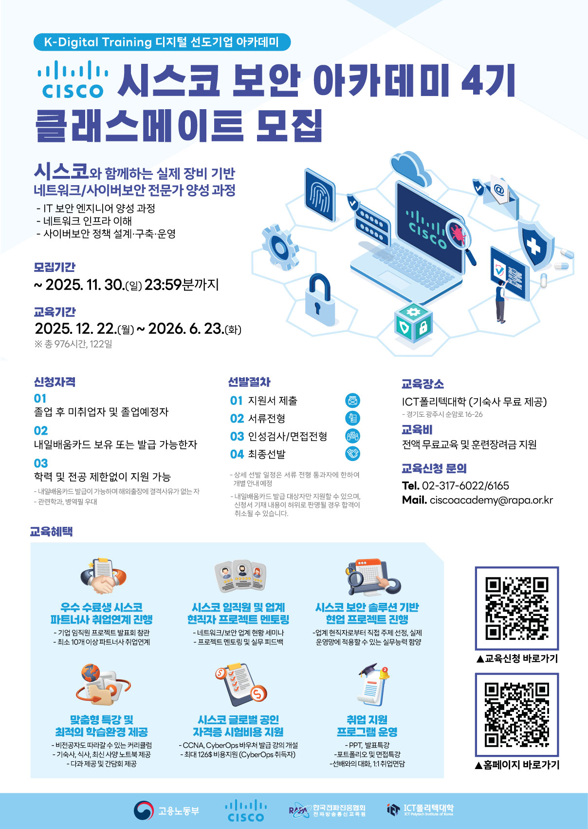 시스코 보안 아카데미 4기 프로그램은 네트워크 및 사이버 보안 전문가 양성을 목적으로 2025년 12월 22일(월)에 시작되어 2026년 6월 23일(화)까지 6개월(총 976시간) 동안 ICT폴리텍대학(경기도 광주시 소재)에서 진행한다. 교육생들에게 실제 산업 환경에서 요구하는 기술력을 갖춘 인력을 배출하는 것을 목표로 네트워크 기초와 함께 물리적 보안/사이버 보안 등 현대 IT 보안의 주요 분야에 대한 심도 있는 교육을 제공할 예정이다.