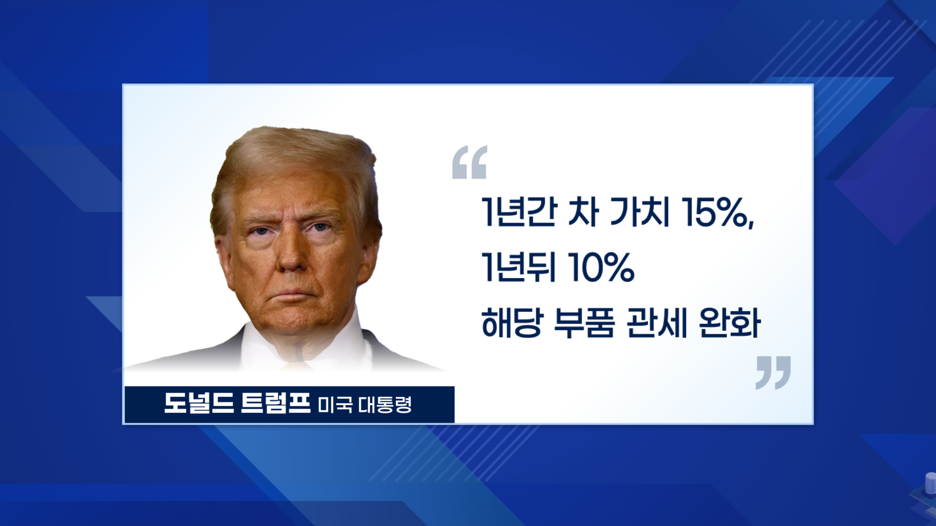 트럼프 대통령은 지난 4월 서명한 포고문에서 1년간 차 제조사가 미 현지에서 조립한 차의 가치의 15%에 해당하는 부품 관세를 줄이겠다고 밝혔습니다.