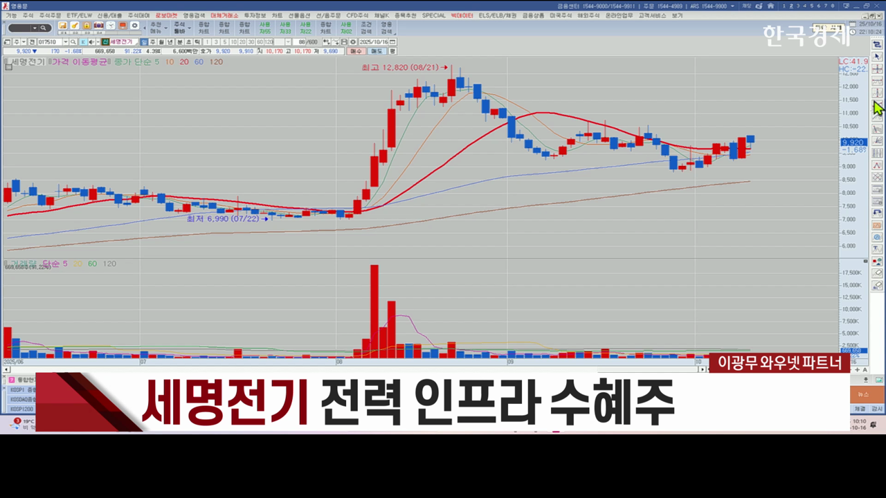 이광무 대표는 첫 종목으로 ▲세명전기(017510)를 선택했다. 그는 “AI 데이터센터와 전력 인프라 교체 수요가 겹치며 실적이 개선되고 있다”며 “삼각수렴 구간에서 20일선을 돌파하며 기술적 전환점을 맞고 있다”고 평가했다. 이어 “상대적으로 조정이 마무리된 구간으로, 타 종목 대비 리스크가 낮은 자리”라고 덧붙였다.