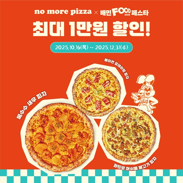 노모어피자 관계자는 “배달의민족과 함께 진행하는 이번 푸드페스타는 고객 감사의 의미를 담은 4분기 최대 프로젝트”라며 “연말까지 이어지는 긴 행사기간 동안 더 많은 고객이 다양한 혜택을 누리길 바란다”라고 전했다.