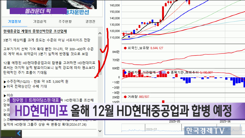 [정우영 트레이딩스핀 대표] [이경락 와우넷 파트너] ● 핵심 포인트 - 전문가들은 내일 장을 위해 한화엔진, 오리엔탈정공, 세진중공업, 일승, HD현대미포를 추천함. - 이들 종목은 모두 수급, 차트, 실적이 조화를 이루며 높은 점수를 받음. - 이경락 대표는 '일승', 정우영 대표는 'HD현대미포'를 선택했으며, 이전에도 해당 종목들을 추천한 바 있음. - 선정 기준으로는 실적, 차트, 수급, 매수 관점에서 객관적 지표가 충족되는지를 봄. - HD현대미포는 중소형 선박 제조사로, 고부가가치 선박 확대로 실적 강화 예상됨. - 미국 전략상선단의 수혜 및 전고점 돌파 가능성이 높아 관심 필요. - 일승은 조선업 회복에 따른 탄력적 움직임으로 주목받고 있으며, 변동성은 크지만 수급 상황은 긍정적임. - 일승의 목표가는 6500원으로 설정되었으며, 단기적 트레이딩 전략을 제안함.