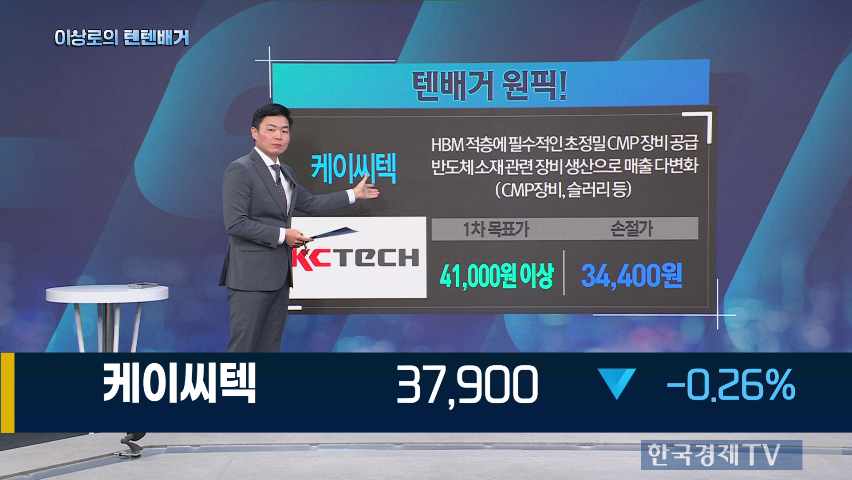 추천 종목으로는 케이씨텍을 꼽으며, 목표가는 4만 1천 원, 손절가는 3만 4,400원으로 제시합니다.