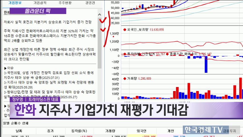 정우영 대표는 한화를 선택했으며, 이는 지주사로 실적 호전 및 지분 가치 상승으로 기업 가치 증가가 예상되기 때문이라고 밝혔습니다. 한화는 주력 자회사인 한화에어로스페이스 지분 32%의 가치가 약 16조 원으로 평가되며, 현재 시총 대비 2배 이상이라 저평가 상태라고 분석되었습니다.