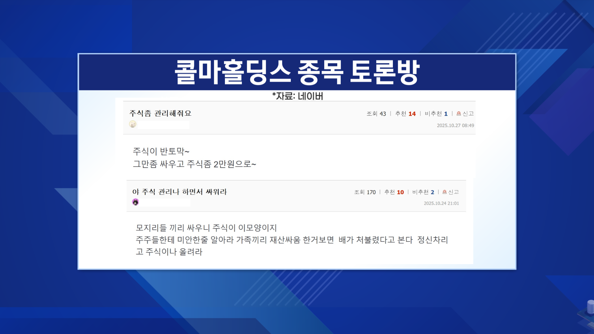 실제로 온라인 종목 토론방에는 "주식 반토막, 그만 좀 싸우고 관리 좀 해달라" "주가 관리나 하면서 싸워라 " 등의 토로가 쏟아지고 있습니다.