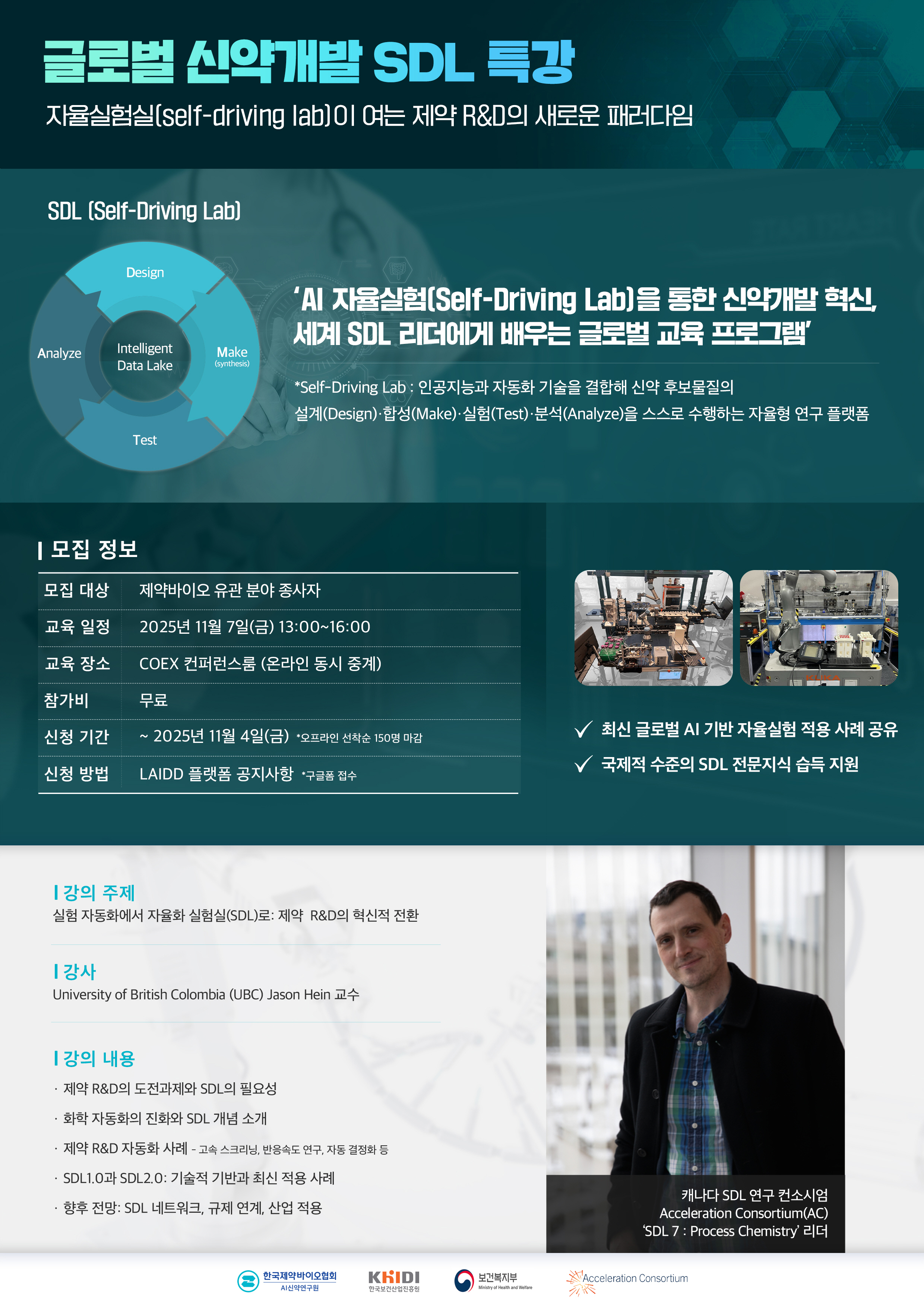 행사는 AI 기반 신약개발 자율실험실(Self-Driving Lab, 이하 SDL) 분야의 세계적 석학 캐나다 브리티시컬럼비아대(University of British Columbia, UBC) 제이슨 하인(Jason Hein) 교수를 초청해 진행된다. 하인 교수는 화학 반응 자동화 및 SDL 기술의 선도적 연구자로, 글로벌 제약 R&D 분야에서 자율화 실험의 혁신을 선도하고 있다.