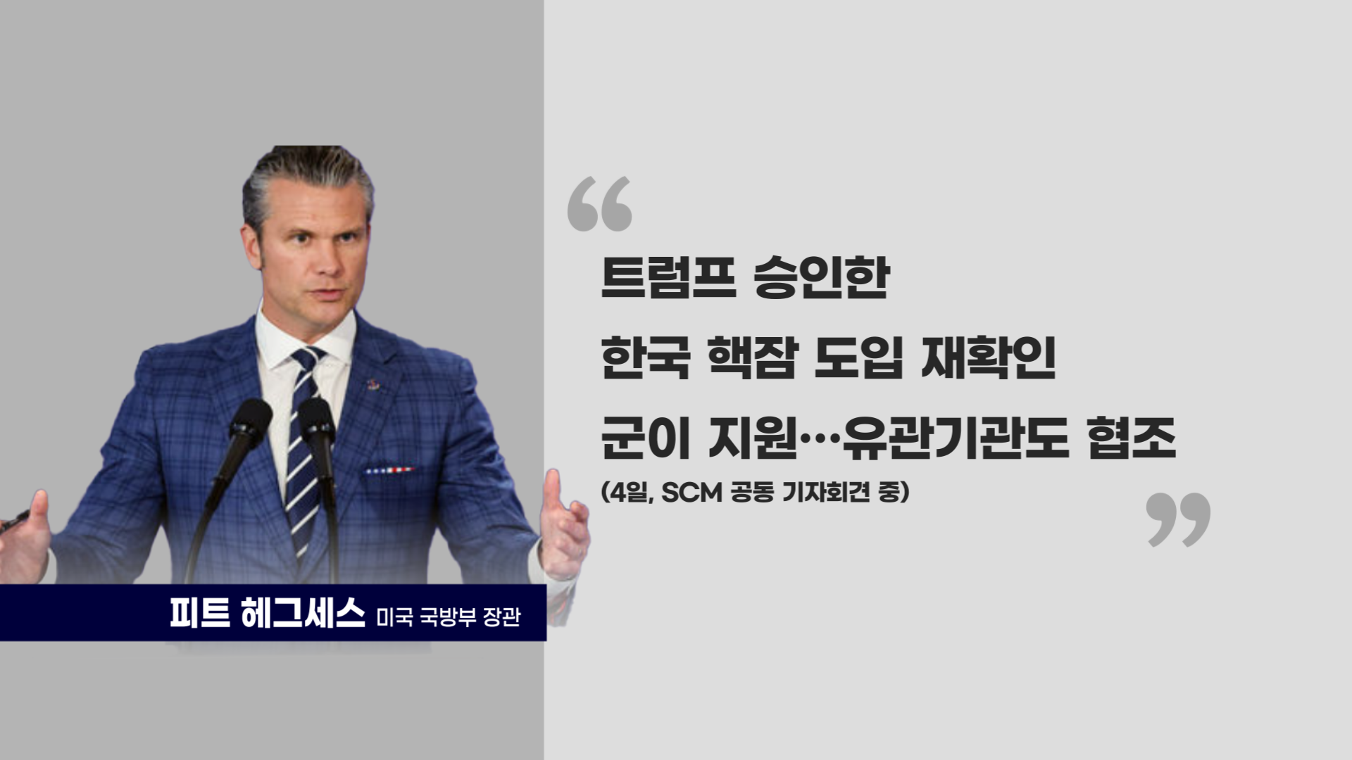 헤그세스 미 국방장관은 기자회견에서 “트럼프 대통령이 승인한 한국의 핵추진 잠수함 도입을 다시 한 번 확인한다”라고 공식화했습니다.