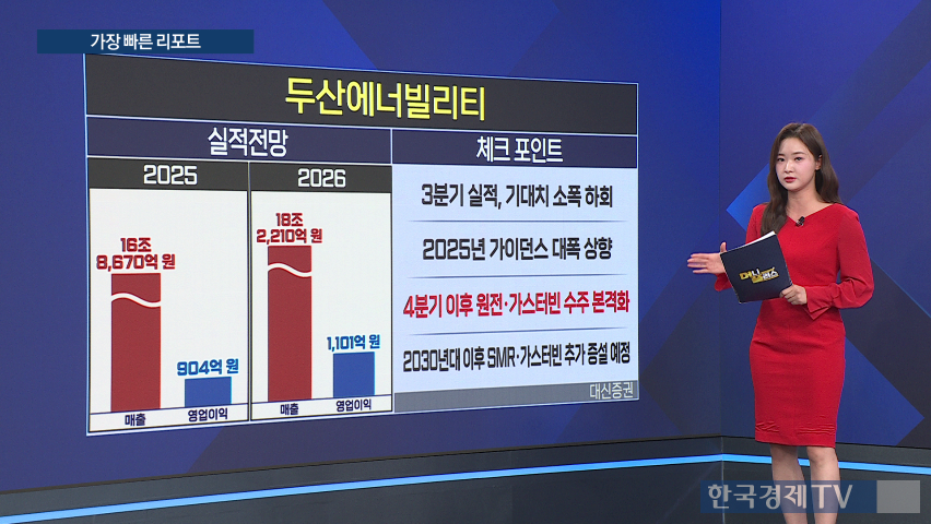● 두산에너빌리티 · NAVER 목표주가 상향 [가장 빠른 리포트] 두산에너빌리티는 어제 실적 발표 후 주가가 크게 조정되었으나, 대신증권은 목표주가를 11만 원으로 상향하며 긍정적인 전망을 제시했습니다. 대신증권은 두산에너빌리티의 수주 전망을 최대 14조 원으로 예상하며, 일론 머스크의 인공지능 스타트업 xAI로부터 가스 터빈 수주를 성공한 점을 긍정적으로 평가했습니다. 3분기 실적은 일회성 비용으로 기대치에 못 미쳤지만, 4분기부터는 원전 주기기와 SMR, 가스 터빈 수주가 본격화될 것으로 전망됩니다. 체코와 웨스팅하우스, 미국과 폴란드 신규 원전 등 글로벌 수주가 이어지고, 가스 터빈도 연간 8기 수주가 가능할 것으로 보입니다. 더 나아가서 2030년대 성장 기반도 이미 설계되고 있습니다. SMR 생산 능력은 2028년 20기에서 2035년 30기로, 가스 터빈은 2035년 16기로 확대될 예정입니다.