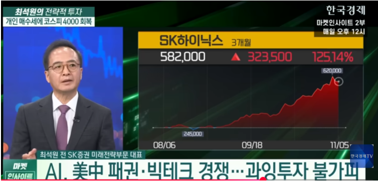 ● 핵심 포인트 [최석원 전 SK증권 미래전략부문 대표] - 코스피와 코스닥 모두 어제 낙폭을 회복하며 오늘 빨간불을 기록함. - 전문가들은 한국 증시가 올해 70% 상승했으나, 이는 타국 대비 높은 수익률이며, 작년 타국이 오를 때 한국은 10% 빠진 것에 대한 정상화로 해석됨. - 미국 증시의 12개월 포워드 PER은 22.8배로 5년 평균 대비 16% 높으나, 실적 개선이 이를 뒷받침한다고 분석함. - 한국 역시 ROE가 10% 이상의 상승 흐름 보이며, PER은 12배 초반 수준으로 실적 증가율이 밸류에이션 부담을 완화시킬 것으로 예상됨. - 반도체 가격 급등이 한국 실적 개선에 긍정적인 영향을 미칠 것이라 평가함. - 내년에는 경기 둔화와 달러 약세로 인해 균형 있는 포트폴리오 전략이 필요함. - 주식, 채권, 대체 투자를 균형 있게 분배해야 하며, 특히 AI 수요 및 금리 인하로 인한 유동성 효과가 기대됨. - 일본 시장의 경우, 밸류업 프로그램과 공급망 재편 등으로 기업 체질 개선되며 주목받고 있음. - 달러는 올해 약 8% 하락했으며, 내년에도 연준과 ECB의 정책 차이로 인해 완만한 약세가 지속될 전망임. - 자산 배분은 주식 40%, 채권 40%, 금 10%, 리츠 10% 비율로 추천함. - 금 가격은 이미 많이 올랐으나, 달러 약세와 글로벌 중앙은행들의 매입으로 여전히 보유 가치가 있다고 평가함.