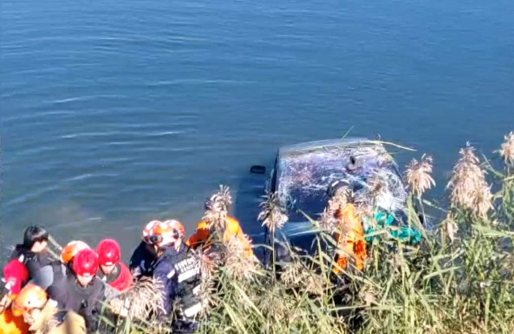 차량은 절반 가량이 물에 잠긴 채 멈췄으며, 충격으로 문이 열리지 않았던 것으로 알려졌다.