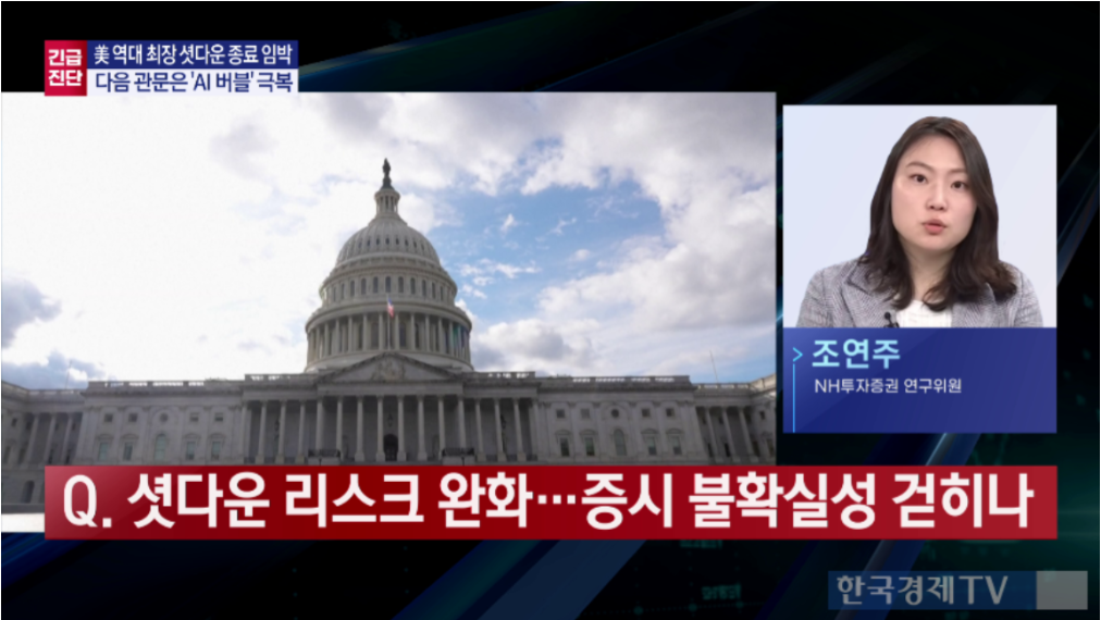 조연주 NH투자증권 연구위원은 13일 한국경제TV에 "미국 정부 셧다운이 주식시장을 크게 흔들지는 않았지만, 그동안 지수 상단을 제한하는 요인으로 작용했다"며 "셧다운 종료는 12월 금리 인하 기대를 키우는 만큼 증시에 긍정적 재료"라고 평가했다.