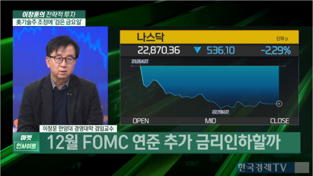이창훈 한양대 경영대학 겸임교수는 14일 한국경제TV에 출연해 "12월 연방공개시장위원회(FOMC)는 금리 인하보다는 동결 가능성이 다소 커진 상황이며, 결국 연준은 데이터 디펜던트한 결정을 내릴 것이다"고 말했다.