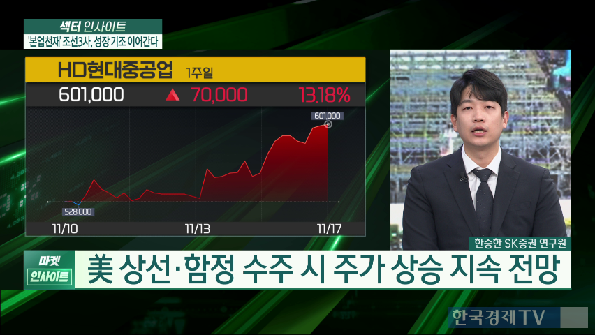 ● "조선주, 단기 조정시 매수 기회…HD현대중공업 최선호주" 조선주는 올해 내내 시장을 주도하다가 최근 들어 잠시 쉬어가는 모습을 보이고 있습니다. 전문가들은 미국과의 동맹 관계가 여전히 조선주 상승의 주요 모멘텀으로 작용하고 있다고 분석합니다. 미국은 오랜 기간 쇠퇴한 조선업을 되살리기 위해 한국과 일본 같은 동맹국의 조선업 역량을 필요로 하고 있으며, 특히 러시아와 중국의 해군 현대화에 대응하기 위한 목적이 큽니다.