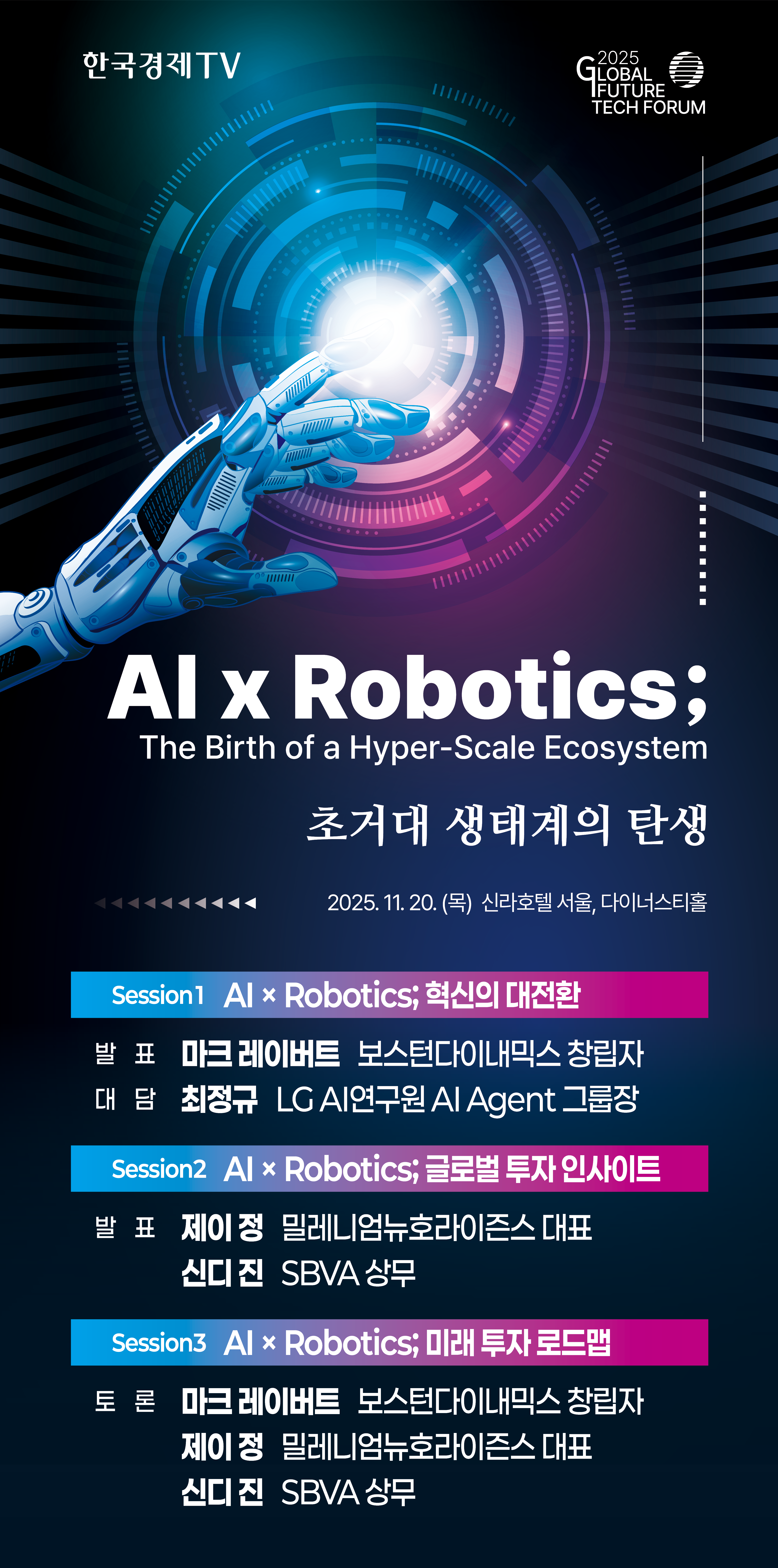 '2025 글로벌 미래기술 포럼'에는 투자 전문가도 총출동한다. 제이 정 밀레니엄뉴호라이즌스 대표, 신디 진 SBVA(전 소프트뱅크벤처스) 상무가 피지컬 AI 투자 전략을 소개한다.
