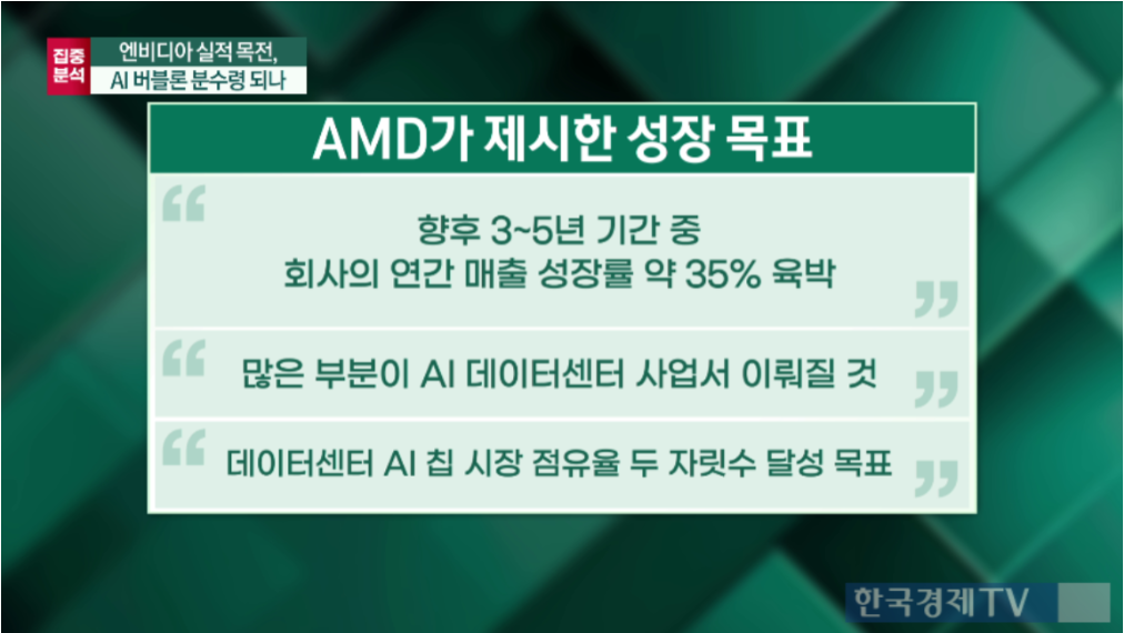 - AMD는 오픈AI와의 대형 계약에 더해 내년 전체 매출 성장률 35%, 데이터센터 매출 성장률 60% 가이던스를 제시함.