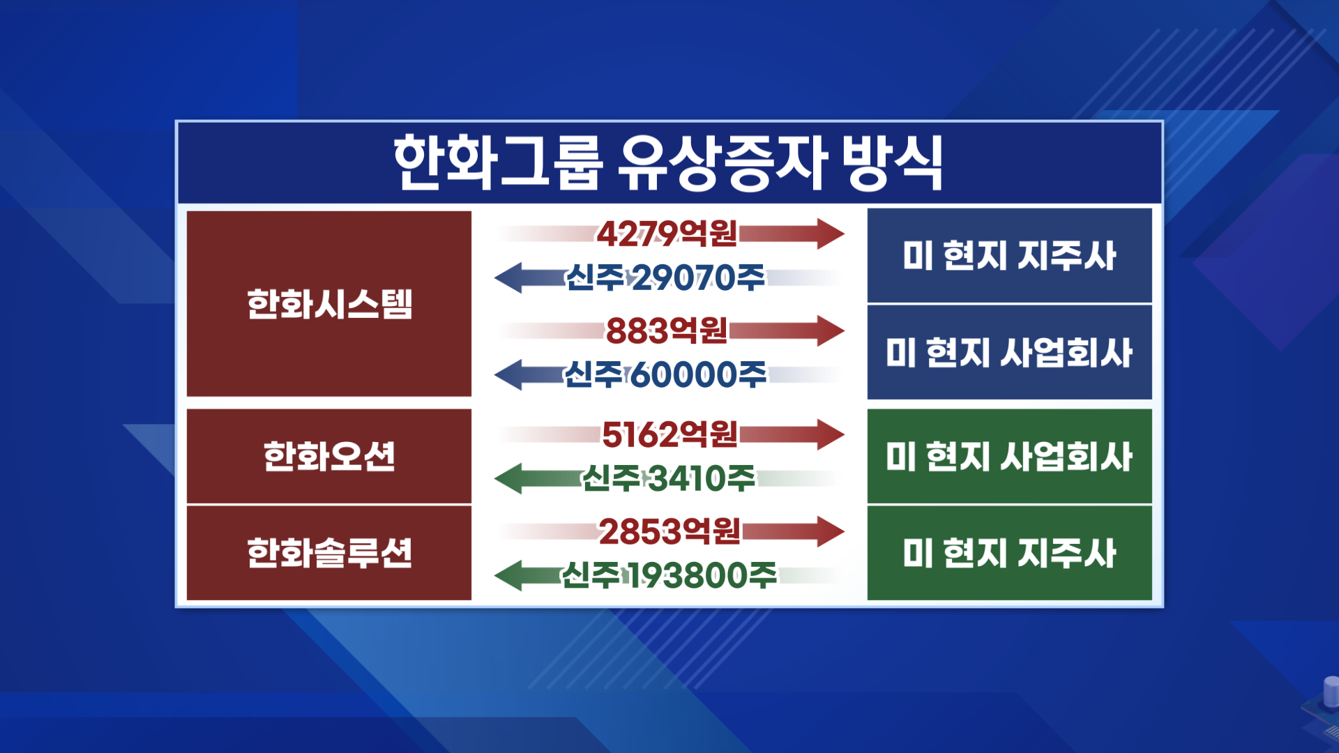 미국에서 사업을 추진 중인 한화그룹의 현지 자회사들이 신주를 발행했고, 모회사들이 돈을 주고 새로운 주식을 샀습니다.