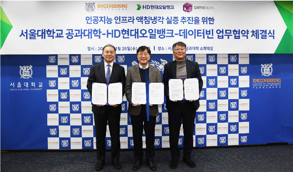 HD현대오일뱅크는 서울대학교 공과대학 및 액침냉각 시스템 운영업체인 데이터빈과 함께 ‘인공지능 인프라 액침냉각 실증 프로젝트’ 양해각서를 체결했다고 26일 밝혔다.