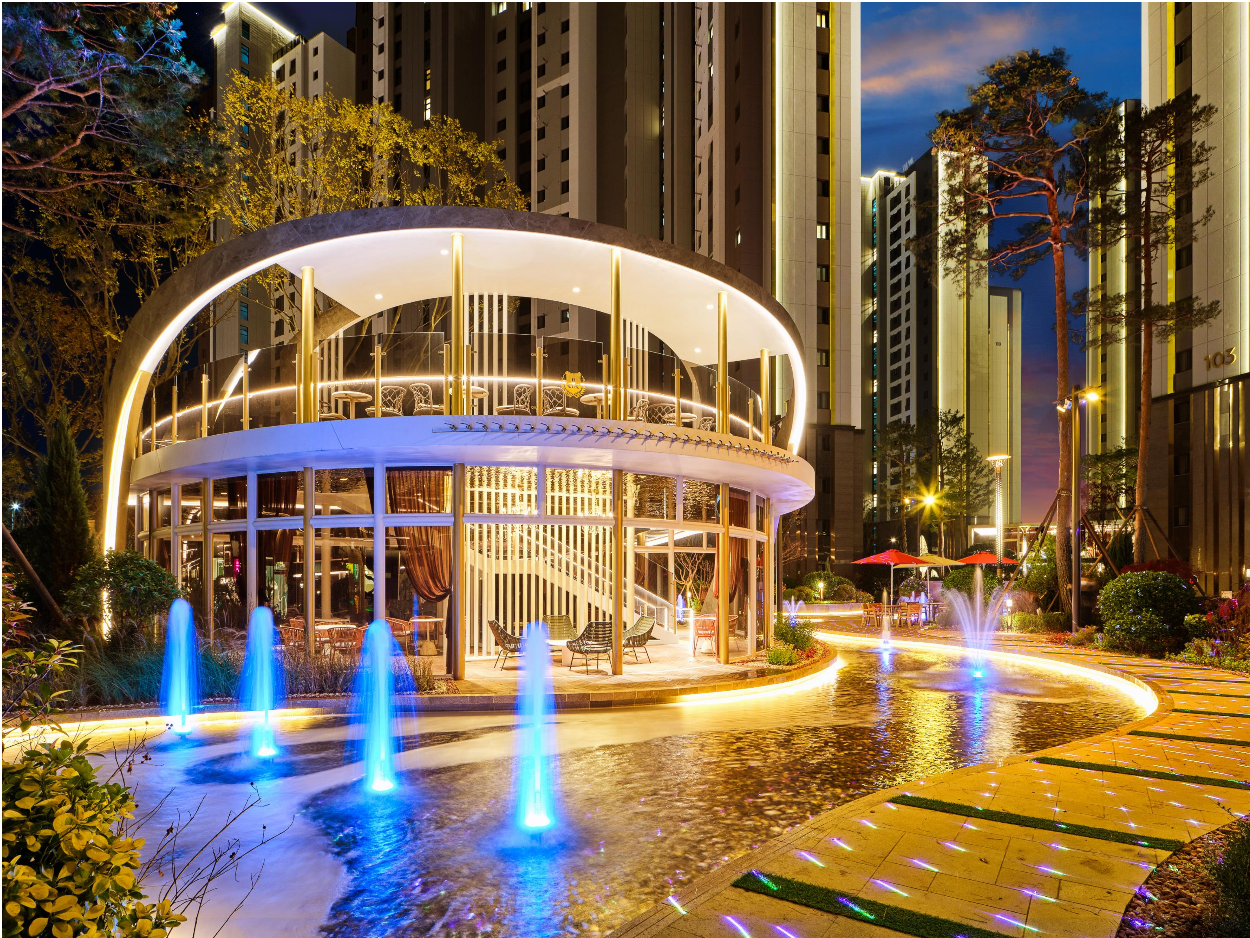 여기에 이탈리아 티볼리의 세계문화유산인 ‘빌라 데스테(Villa d’Este)’를 현대적으로 재해석하고, 르네상스 건축의 조형미에서 모티브를 얻은 멀칭(Mulching) 기법을 적용해 시간의 흐름에도 변치 않는 영속성과 관리의 완성미를 구현했다. 나아가 물(水), 나무(木), 돌(石) 그리고 컬러(色)의 정교한 조화를 더함으로써 자연과 예술이 어우러진 조경의 품격을 완성했다.
