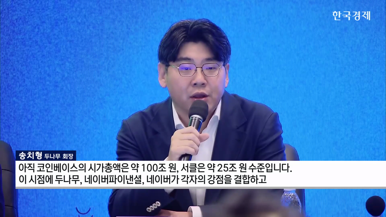[송치형 두나무 회장 : 아직 코인베이스의 시가총액은 약 100조 원, 서클은 약 25조 원 수준입니다. 이 시점에 두나무, 네이버파이낸셜, 네이버가 각자의 강점을 결합하고 시너지를 낸다면 기술력, 신뢰, 고객 기반 모두에서 세계적인 경쟁력을 확보할 수 있습니다.]