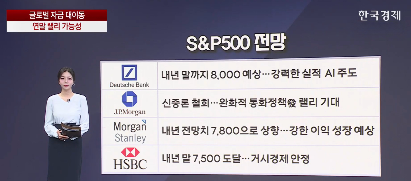 AI 버블론이 구글의 제미나이3.0 호평으로 진정됐고 금리 인하 기대감에 따라 유동성 불안까지 일부 해소되면서 증시는 상승세로 돌아섰죠. 이에 CNBC는 “금리 인하 전망과 함께 유동성 랠리 기대감이 커졌다”고 전했습니다. 찰스슈왑 역시 “시장은 지난 21일 저점에서 비교적 탄탄한 상승세를 보였으며 이번주 시장 폭의 확대와 자금 유입이 반등의 주요 동력으로 작용했다”고 짚었습니다. 월가가 내놓은 내년 말 S&P500 지수의 전망치는 7천 중반에서 8천에 달하는 등 강세장을 예측하는 목소리가 더 커지고 있으며, 여전히 남아있는 AI 버블 우려와 패권 경쟁 속 유동성 공급은 증시를 지탱하는 가장 큰 힘이라고 하니 다음 달 FOMC에서 나올 이야기들도 더 주목해보시면 좋을 것 같습니다.