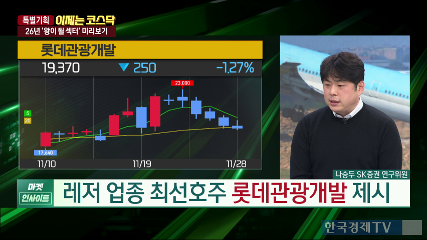● "외국인 관광객 증가...롯데관광개발 최선호주" 코스닥 시장은 연초 대비 약 20%, 연중 최대 30% 상승했지만, 코스피와 대형주 대비 상대적 열세로 평가된다. 그러나 전문가들은 코스닥만의 절대적 수익률을 부정적으로 보기 어렵다고 진단한다. 반도체 부품·장비업체, 피지컬AI 기반 로봇주, 바이오 기업들이 두드러진 성과를 보였다.