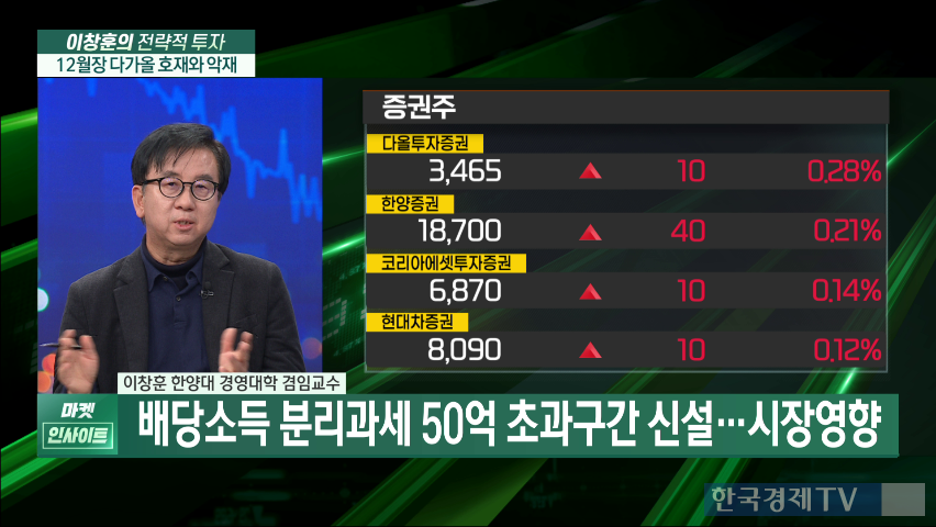 또한 여야는 배당소득 분리과세에 대해 최고 세율을 25%로 설정하고, 50억 원을 초과하는 금액에만 30%를 부과하기로 합의했으며, 이는 주가 부양과 사회적 공평성 모두를 고려한 합리적인 결정으로 평가된다. 증권주에 대해서는 긍정적인 전망이 제시되었고, 대형 증권사들의 변화가 가치 평가에 긍정적인 영향을 미칠 것으로 보인다. 반면 은행 계열 금융지주회사들은 이미 배당 이슈가 주가에 충분히 반영되었으므로 추가적인 상승 여력은 제한적일 것으로 예상된다.