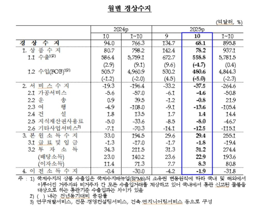 다만 올 들어 10월까지 누적 경상수지 흑자(895억8천만달러)는 지난해 같은 기간(766억3천만달러)보다 약 17% 늘었다.