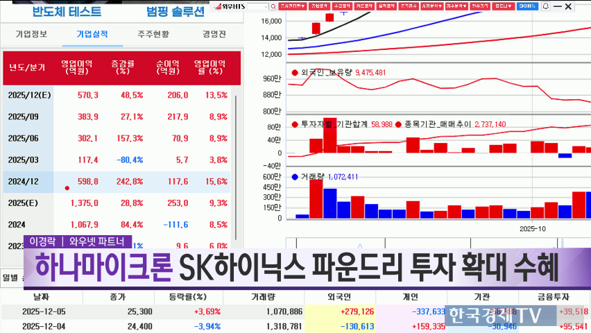● 핵심 포인트 - 오늘은 비에이치아이, 대우건설, 와이씨, 하나마이크론, HMM 등이 주목받고 있으며, 이들 종목은 수급, 차트, 실적이 모두 긍정적인 상태임. - 이경락 파트너는 하나마이크론을 추천했으며, 해당 기업은 국내 OSAT 1위로 메모리 및 비메모리 패키징 분야에서 경쟁력을 보유함. - 하나마이크론은 베트남에 대규모 투자를 진행 중이며, 내년에는 생산능력 확대로 인해 영업이익이 2400억원에 이를 것으로 예상됨. - 이광무 파트너는 대우건설을 선택했으며, 북미 원전과 가스 프로젝트, 체코 원전 사업 참여 가능성 등을 이유로 제시함. - 최근 정부의 새로운 부동산 정책 발표 기대감과 대출 규제 강화로 인한 중저가 아파트 수요 증가가 중소형 건설사에 긍정적 영향을 미칠 전망임. - 외국인 투자자들이 대우건설에 대해 강한 매수세를 보이고 있어 주가의 추가 상승 가능성이 높아지고 있음.