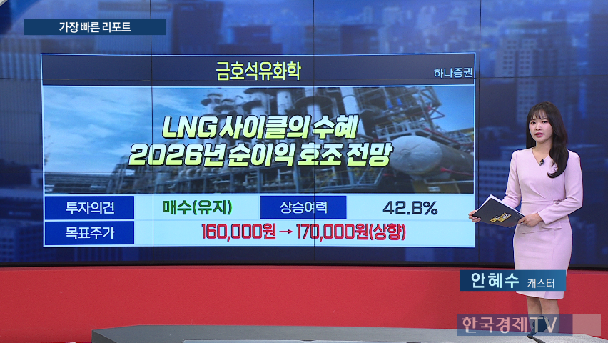 ● 금호석유화학 · NHN 목표가 상향 [가장 빠른 리포트] 글로벌 LNG 수출 확대에 힘입어 화학 업황의 새로운 반등 국면을 맞이한 금호석유화학, 목표가 17만 원이 됐습니다. 현재 기준 상승 여력 42.8%인데요. 먼저 미국 LNG 수출량은 전년 대비 40% 증가한 1070만 톤. 2026년까지 LNG 물량 확대가 지속되면서 단열 핵심 소재인 폴리우레탄폼 수요도 강하게 증가할 예정입니다. 두 번째는 금호미쓰이화학의 업황 회복 신호인데요. 금호석유 지분법 이익 급증으로 연결될 예정입니다. 하나증권은 지분법 이익을 2026년 33% 증가한 1800억 원으로 전망하고요. 내년에는 더 늘어날 것으로 기대했습니다. 또한 내년엔 순이익이 영업이익보다 높아질 것으로 예상됩니다. 2026년 금호석유화학 순이익은 5045억 원으로 영업이익 4281억 원보다 더 높은 구조가 나타납니다. 2026년 LNG 사이클, 상법 개정 수혜까지 더해지면서 밸류에이션 매력도 극대화되는데요. 2026년 예상 PER은 6.9배, PBR은 0.5배로 업종 평균 대비 절대 저평가 영역입니다. 여기에 상법 개정으로 배당소득 분리과세와 자사주 소각 확대 가능성까지 부각되면서 주주환원 매력도 크게 높아지는 구간이라는 점 투자에 참고하시고요.