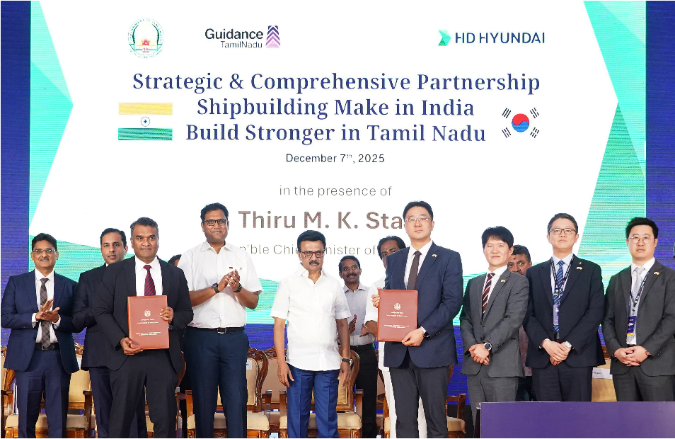 HD현대는 최근 인도 남부 타밀나두(Tamil Nadu) 주(州) 마두라이(Madurai)에서 스탈린(M.K Stalin) 주 총리 및 라자(T.R.B Rajaa) 주 산업부 장관, 최한내 HD한국조선해양 기획부문장이 참석한 가운데 ‘신규 조선소 건설에 관한 배타적 업무협약’을 체결했다고 8일 밝혔다.