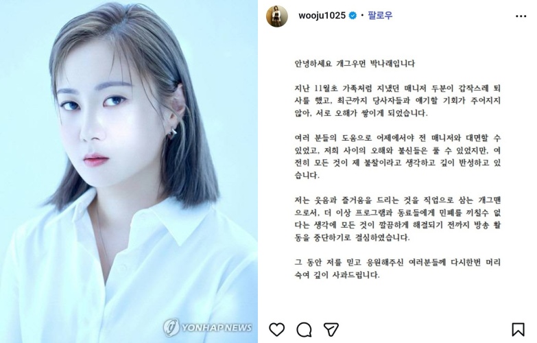 박나래는 8일 자신의 사회관계망서비스(SNS)에 글을 올리고 "모든 것이 깔끔하게 해결되기 전까지 방송활동을 중단하기로 결심했다"고 밝혔다.