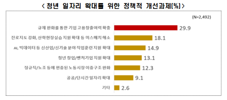 대학생들은 청년 취업난 해소를 위한 정책적 개선 과제로 규제 완화 등 기업 고용여건 개선(29.9%)을 가장 많이 꼽았다.