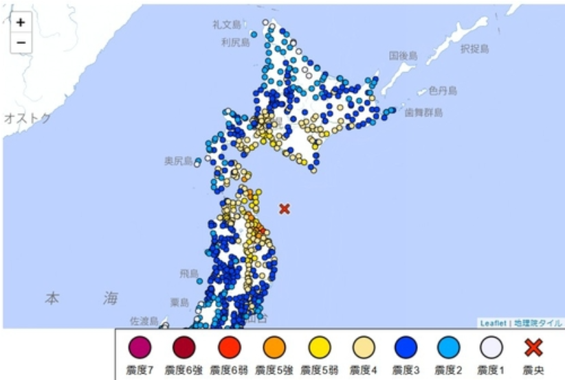 홋카이도 하코다테시에서도 진도 5강의 흔들림이 관측됐다. 강도가 센 지진이라 도쿄 등 수도권에서도 진도3의 흔들림이 느껴졌다.