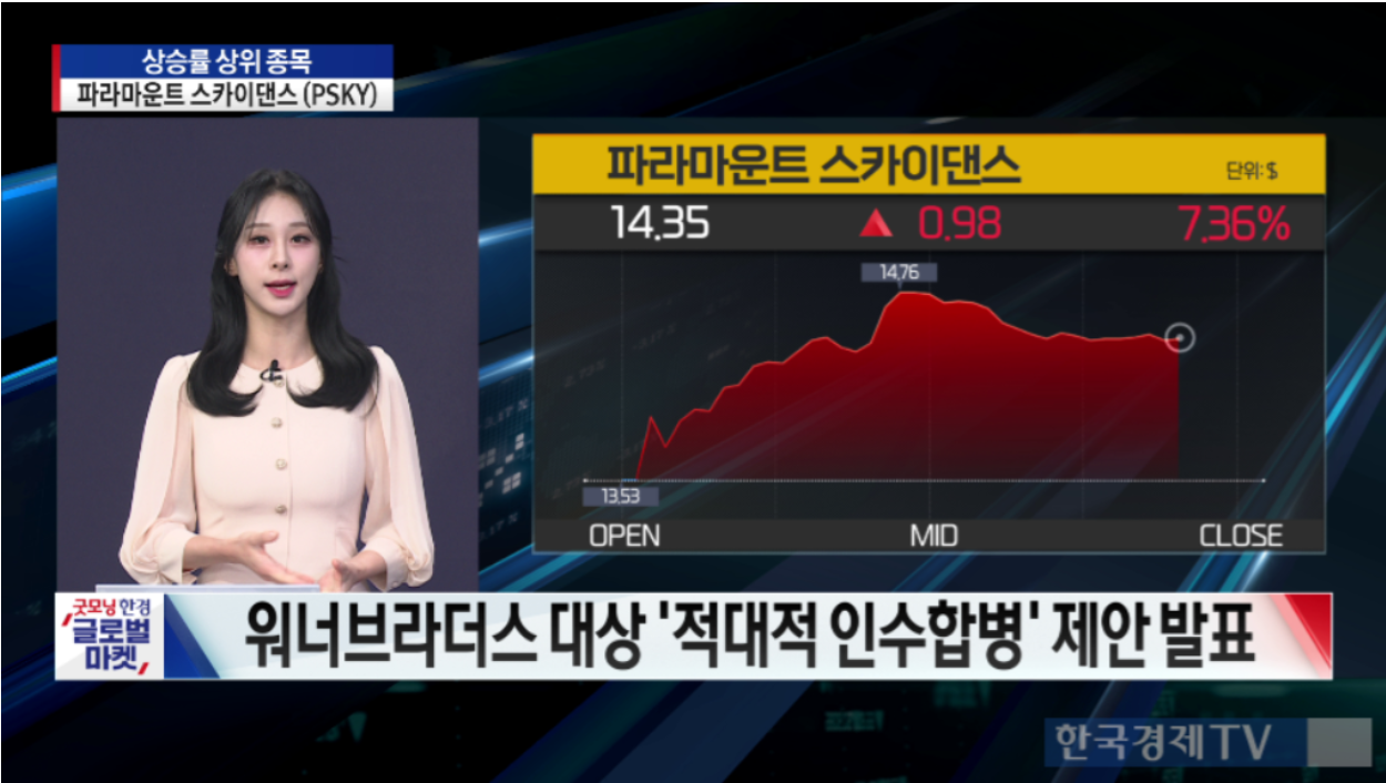 - 이날 뉴욕 증시에서 파라마운트 주가는 9.02%, 워너는 4.41% 상승 마감함.