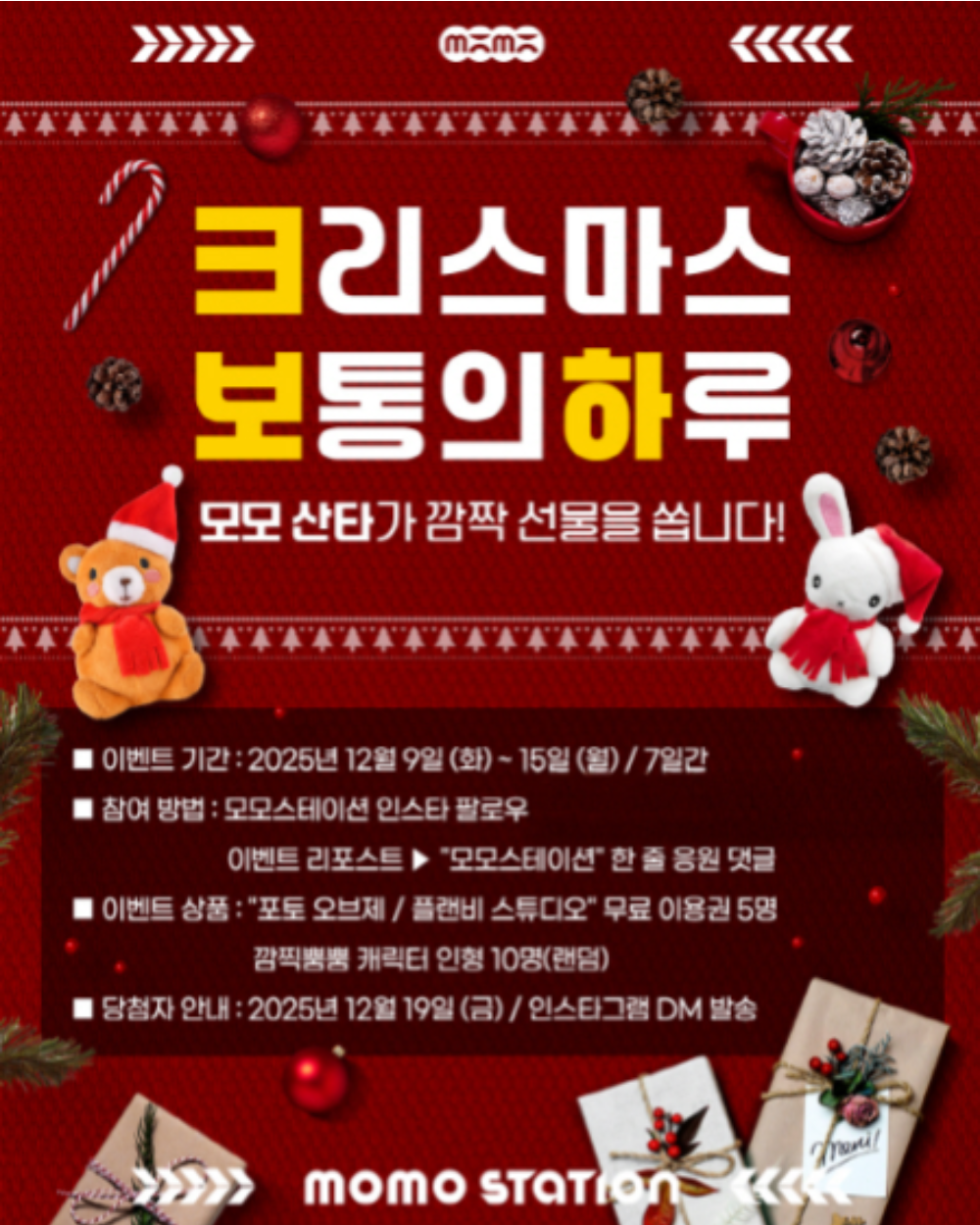 모모 스테이션 관계자는 “모모 스테이션(무인 인형 뽑기방)과 포토 오브제ㆍ플랜비 스튜디오(무인 셀프스튜디오)의 다양한 즐거움을 보다 많은 고객이 경험하길 바라는 마음으로 연말 프로모션을 기획했다”며 “작은 선물이지만 따뜻한 연말 분위기 속에서 모모스테이션이 특별한 하루를 선물하는 브랜드로 기억되기를 바란다”고 말했다.