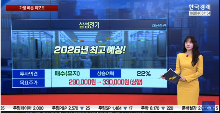 ● 핵심 포인트 [안혜수 한국경제TV 캐스터] - 어제 삼성전기가 52주 신고가를 돌파하며 최근 주가가 상승 추세임. 삼성전기는 환율 상승 효과 및 MLCC, 고부가가치 제품의 비중 확대로 인해 2025년 4개 분기 동안 영업이익 컨센서스를 지속적으로 초과 달성할 전망이며, 2026년에는 매출 1조 원 이상의 역대 최고 실적을 기록할 것으로 예상됨. 데이터 센터와 ASIC 등 AI 관련 응용 분야의 비중이 크게 증가하고 있으며, 유리기판이 삼성전기의 밸류에이션을 높이는 요소로 작용함. 대신증권, 삼성전기 목표가를 기존 29만원에서 33만원으로 상향 조정함 - 풍산은 두 개 분기 연속 컨센서스 미달로 목표가가 15만 원으로 하향되었으나, 여전히 방산 부문 증설과 자회사 PMX 회복에 대한 기대가 있음. 풍산의 경우 단기적으로 3, 4분기 영업이익이 각각 711억 원으로 컨센서스에 못 미칠 전망이나, 4분기에는 메탈로스 환입으로 영업이익 손익분기점을 회복할 가능성이 큼. 미국의 구리 관세 인상으로 인한 어려움 속에서도 중장기적으로 판매 단가의 상승이 예상되며, 내년부터 방산 설비 증설 효과가 본격화되어 연간 매출과 영업이익이 크게 증가할 것으로 보임. 2026년까지 방산 영업이익은 32% 증가할 전망임.