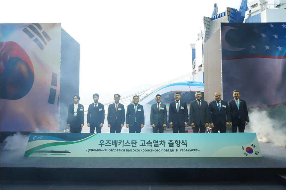 현대로템은 10일 경남 창원시 마산항에서 ‘우즈벡 고속차량 초도 편성 출항식’을 진행했다고 밝혔다. 행사에는 잠쉬드 압두하키모비치 호자예프(Jamshid Abdukhakimovich KHODJAEV) 우즈벡 경제부총리를 포함한 우즈벡과 대한민국 주요 정관계 인사들, 현대로템 임직원 등이 자리했다.