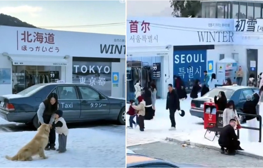 영상 초반에는 가게 간판, 사진 촬영용 구조물, 안내판까지 모두 일본어로 꾸며진 '홋카이도풍 거리' 모습이 등장한다.