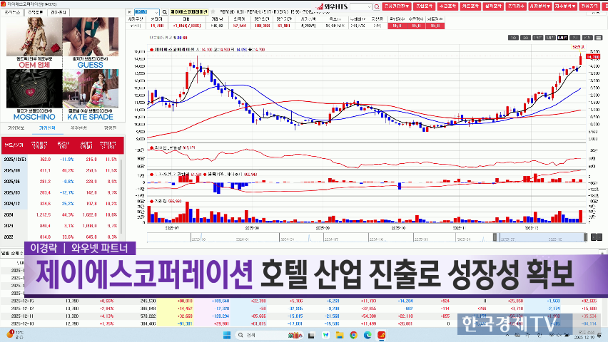제이에스코퍼레이션은 핸드백 가죽 전문 만드는 기업이라고 생각을 많이 하시고 또 가죽을 OEM, ODM 전문적으로 만드는 그런 기업으로만 알고 있고 실적은 좋은데 저평가된 기업으로 아주 가치 투자 관련된 종목으로 다 알고 있었어요. 그런데 그랜드하얏트호텔을 인수한 거 모르고 계셨죠. 알고 있는 분들도 계시고. 바로 동사가 주인입니다. 그러면 저성장에 빠진 핸드백 OEM 업체가 성장 스토리를 얹었기 때문에 이제부터 주가는 재평가될 가능성이 높다는 거죠. 그래서 이 종목을 선택했고요. 또 최근에 한세실험이나 영원무역이나 이런 기업들, 의류 관련된 기업들 올라가는 거 보셨을 거예요. 환율이 올라갈 경우에는 OEM, ODM 업체가 실적이 점프업한다는 논리가 붙거든요. 동사도 핸드백 OEM, ODM 업체니까 당연히 실적은 좋아질 수밖에 없는 그런 구조에서 그랜드하얏트호텔의 실적이 반영되기 시작하면 주가 많이 올라가겠네요. 올해도 실적이 계속 좋았어요. 1분기, 2분기, 3분기, 3분기는 어닝 서프라이즈가 나왔죠. 영업이익률 11.5%. 원래 핸드백 사업은 영업이익률이 5%, 6% 이런데 뭔가 실적이 계속 턴한다는 걸 알 수 있고요. 작년 기준으로 1200억 수익을 냈던 기업입니다. 그런데 시가총액이 얼마냐면요. 지금 작년보다 더 좋아요. 시가총액이 4천억이니까 멀티플이 4배밖에 되지 않아요. 무슨 제지 만드는 기업도 아니고 호텔을 하는 기업인데 너무 싸다는 거죠. 호텔 지분 가치만 더라도 얼마인데 너무 싼 거 아닙니까, 이거? 그리고 외국인과 기관 다 이유가 있죠. 계속 사들이는 이유. 얘도 호텔인데 너도 알아? 나도 알아, 이러면서 서로 사는 거예요. 개인들만 팔고 있네. 개인들이 남 좋은 일 시키고 있어요. 이제부터 관심 있게 볼 필요가 있겠고요. 주가가 계속 올라오고 있습니다. 보시게 되면 52주 신고가에 오늘부터 1일 차트. 모든 점수가 95점. 아주 뜨거운 밤을 보내려고 준비하고 있습니다.