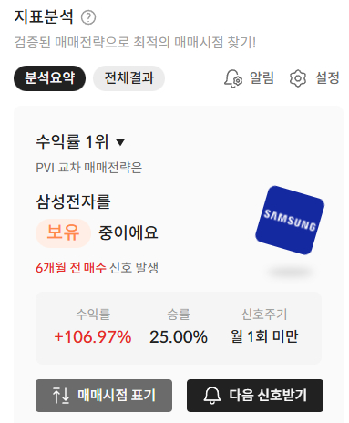 알파스퀘어의 지표분석 기능은 43개 기술적 지표를 활용해 특정 종목에 최적화된 매매 전략을 찾아주는 서비스다. 단순히 지표를 차트에 띄워 주는 것을 넘어, 과거 데이터를 바탕으로 한 시뮬레이션을 통해 가장 높은 수익률과 적중률을 기록한 전략 ‘TOP 3’를 한눈에 확인할 수 있도록 제공한다.