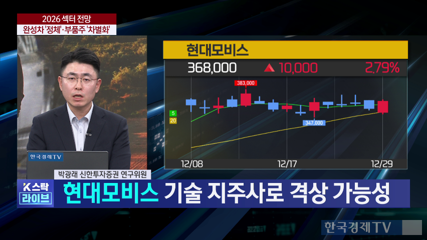 ● "내년 자동차 업종 차별화...현대모비스 최선호" 전문가들은 2026년 자동차 섹터를 '선별의 국면'으로 평가하며, 완성차 시장은 정체되지만 부품 및 기술 분야에서 두드러진 성장이 예상된다고 분석했다. 이들은 관세 인하와 자율주행(SDV) 기술 발전을 자동차주 주가 재평가의 핵심 요소로 꼽았다. 현대차의 SDV 페이스 카 출시는 주가 상승 가능성을 크게 높일 것으로 전망된다.