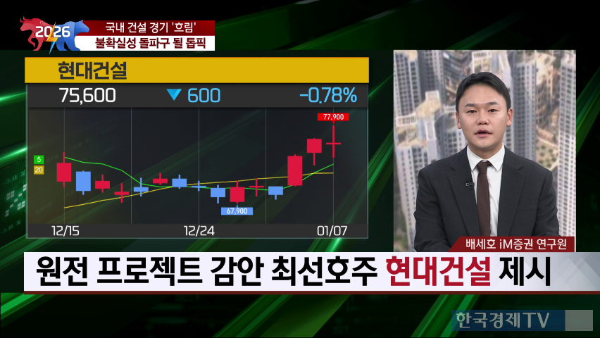 ● "건설 부진 지속...현대건설 美 원전 수주 기대" 반도체 중심의 시장 움직임으로 인해 건설주는 상대적으로 소외되고 있다. 전문가들은 건설 경기 회복이 지연되고 있으며, 지방 미분양 증가와 상업용 부동산 침체로 인해 분양 물량 확대에 어려움을 겪고 있다고 분석했다. 또한 안전사고 리스크와 오는 3월 시행 예정인 노란봉투법으로 인해 건설 시장의 불확실성이 커졌다고 지적했다.