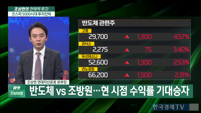 ● "반도체 외 조·방·원 관심...현대차 추가 상승 기대" 코스피 지수가 연일 상승하며 5000포인트를 향한 기대감이 커지고 있습니다. 전문가들은 현재 주가 상승이 실적 기반의 강력한 상승세로 보고 있으며, 특히 반도체 산업의 지속적인 성장을 주목하고 있습니다. 기관 투자자들이 작년 하반기부터 순매도에서 순매수로 전환하며 긍정적인 수급 상황을 만들고 있습니다.