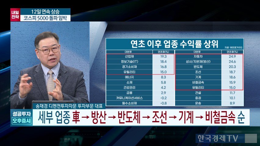 ● "바벨 전략 추천...車·방산·반도체 비중 늘려야" [내일 전략] 코스피 지수가 12거래일 연속 상승하며 5000포인트 돌파 가능성을 높이고 있다. 메모리 반도체 관세 부과 발언에도 삼성전자가 15만원을 기록하고 SK하이닉스는 상승 폭을 확대했다. 전문가들은 이러한 상승세가 마이크론 지원을 위한 러트닉 장관의 발언 때문이라 분석했다. 미국 공장 건설로 인한 비용 증가 상황에서 러트닉 장관은 마이크론을 돕겠다는 의지를 나타냈다. 한편, 코스피는 연초 이후 강력한 상승세를 유지하고 있으나 과열 우려도 제기된다.