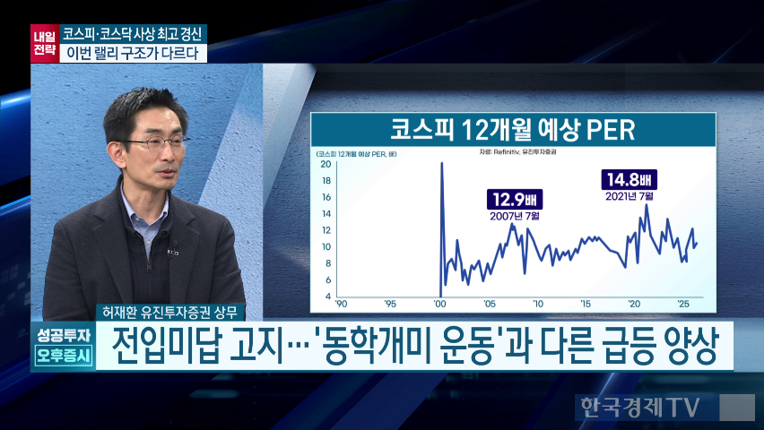 ● 핵심 포인트 - 코스피는 오늘 종가 기준 5170포인트 돌파하며 상승세를 이어갔으며, 코스닥 역시 동반 급등함. - 최근 주가 상승은 과거와는 달리 실적을 기반으로 하고 있어 밸류에이션상 과열 징후가 보이지 않는다는 분석 제시됨. - 외국인의 적극적 매수가 부족한 반면, 기관투자자의 ETF 자금 유입이 시장을 안정적으로 뒷받침하고 있음. - 코스닥 시장은 닷컴 버블 이후 처음으로 1100포인트 돌파했으나, 상장 종목 수 및 이익 증가율 면에서 한계가 지적됨. - ETF 자금 유입 속도가 매우 빨라져 지수 급등을 가속화하고 있으며, 이는 시장의 하방 지지에 긍정적 영향 예상됨. - 반도체 가격 상승세가 지속되고 있으나, 이에 따른 공급 확장이 필요함에 따라 반도체 장비·소재주에 주목할 필요가 있다는 의견 제시됨. - 한국 증시의 시총이 독일 증시를 넘어섰으나, 여전히 주요국 대비 저평가 상태로 추가 상승 여력 존재한다는 평가가 나옴.