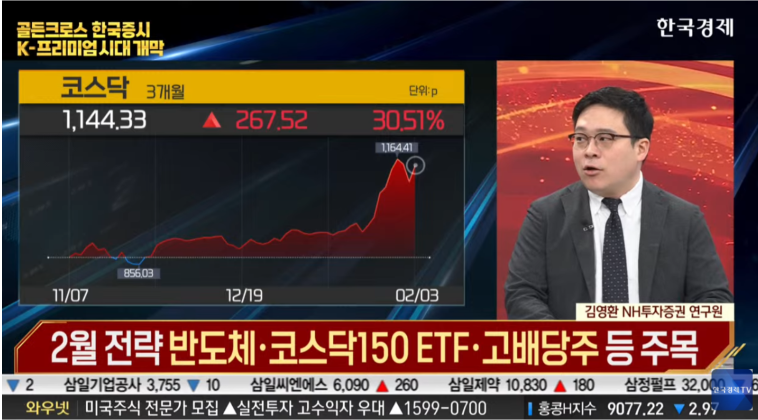 ● 핵심 포인트 [김영환 NH투자증권 연구원] - 국내 증시는 2월 들어 변동성이 매우 크며, 거래대금은 110조 원을 돌파함. 삼성전자의 일일 상승폭이 10%를 넘으며 사상 최고치를 기록함 - 시장의 변동성으로 인해 신용 매수의 영향이 커지고 있으며, 이에 따라 레버리지 투자를 피하고 변동성에 대비해 비중 조절이 필요하다고 조언함 - 반도체 업종이 주도주로서 지위를 유지할 것으로 보이며, 특히 삼성전자와 SK하이닉스는 추가 상승 여력이 있다고 평가됨 - 개인투자자들의 유동성이 시장에 긍정적 영향을 미치고 있으나, 신용 사용 비중이 높아 변동성을 확대시킬 우려가 있음 - 2월의 투자 전략으로는 반도체, 코스닥150 ETF, 고배당주에 분산 투자하는 것을 추천함. - 삼성전자와 SK하이닉스가 증설을 계획하고 있지만 과거 슈퍼 사이클만큼의 대규모 증설은 아니므로 이들 기업의 독점적 이익 가능성이 큼.